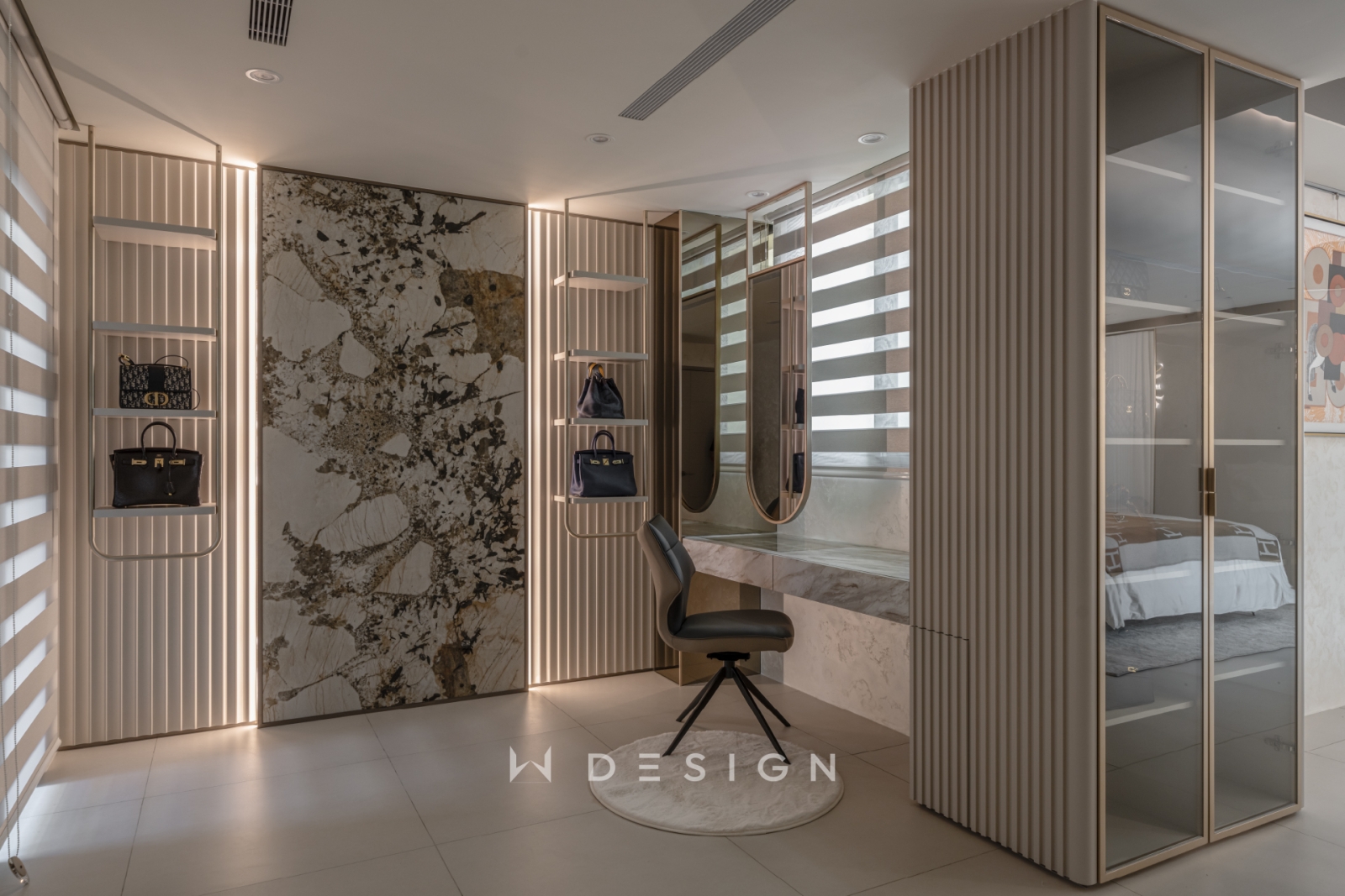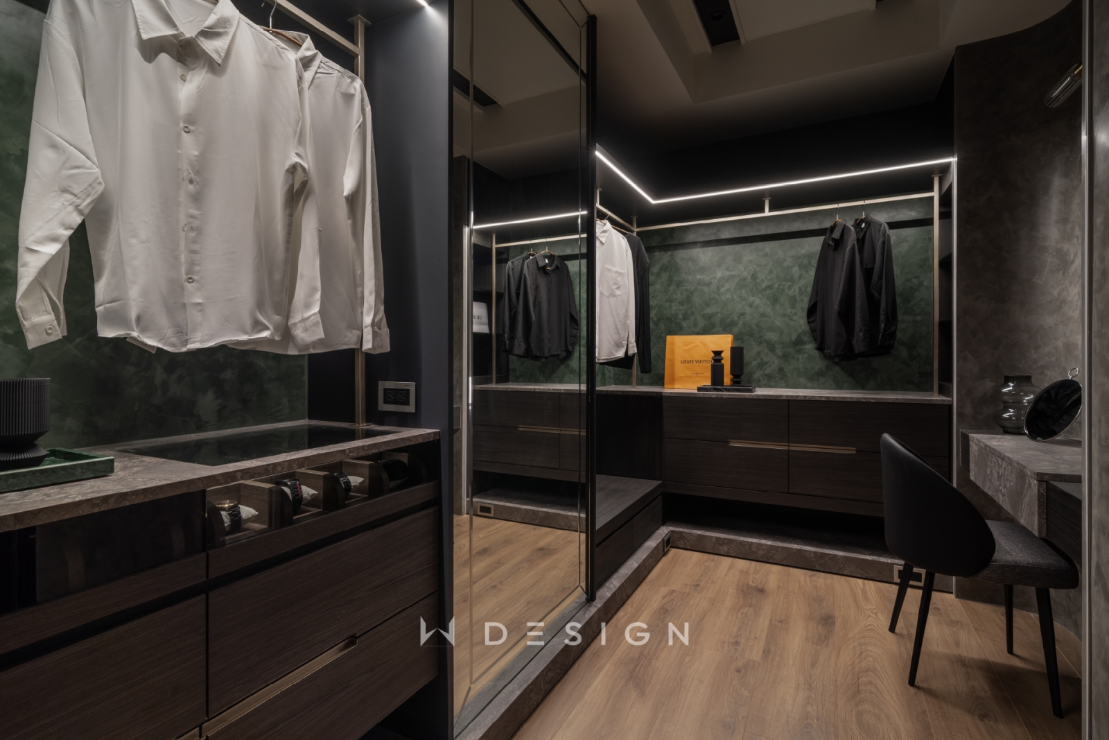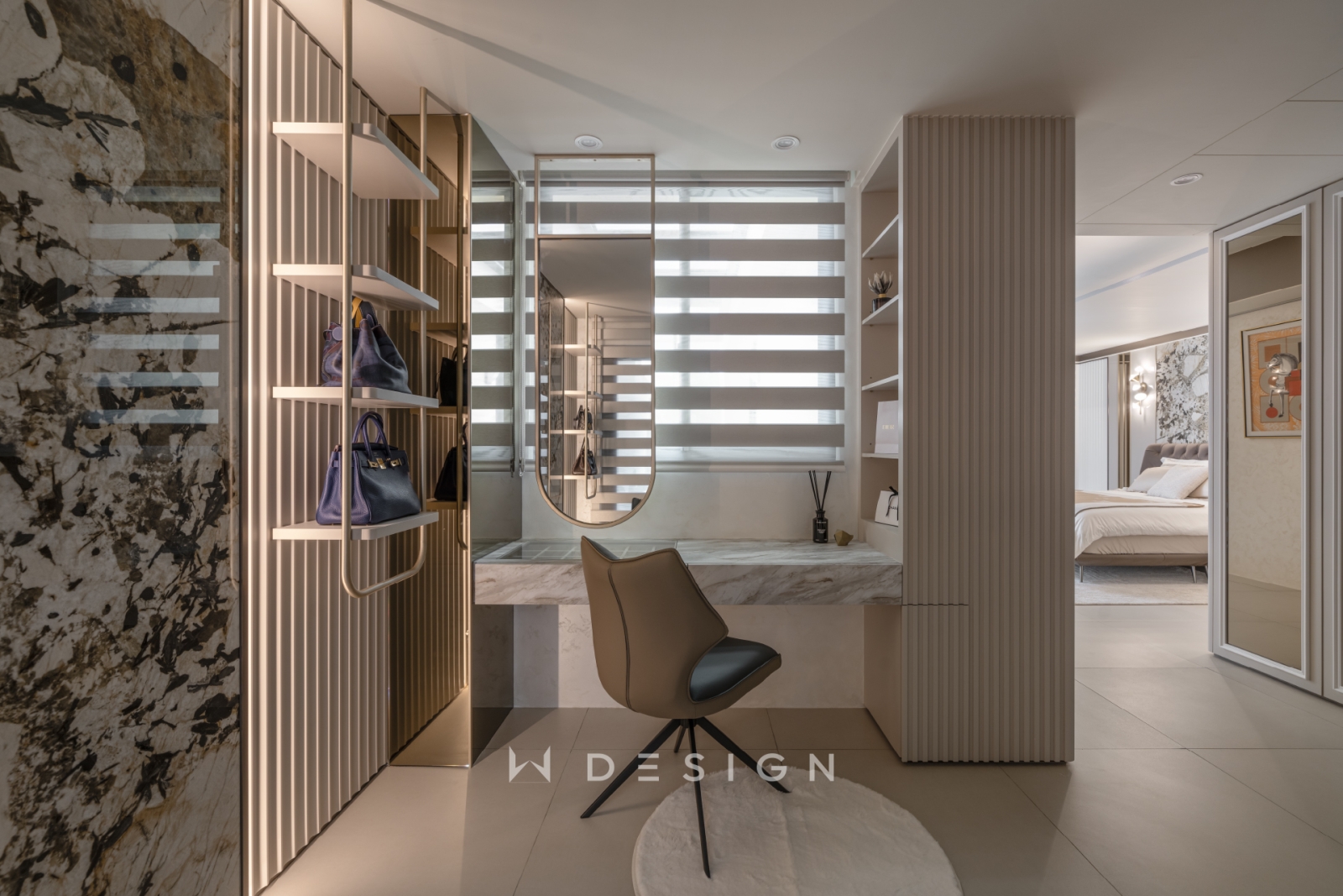 可規劃「獨立式更衣室」,打造專屬私人空間。除了衣櫃與穿衣鏡外,可加入中島櫃、飾品區與化妝檯,打造宛如精品精品店般的高質感氛圍。