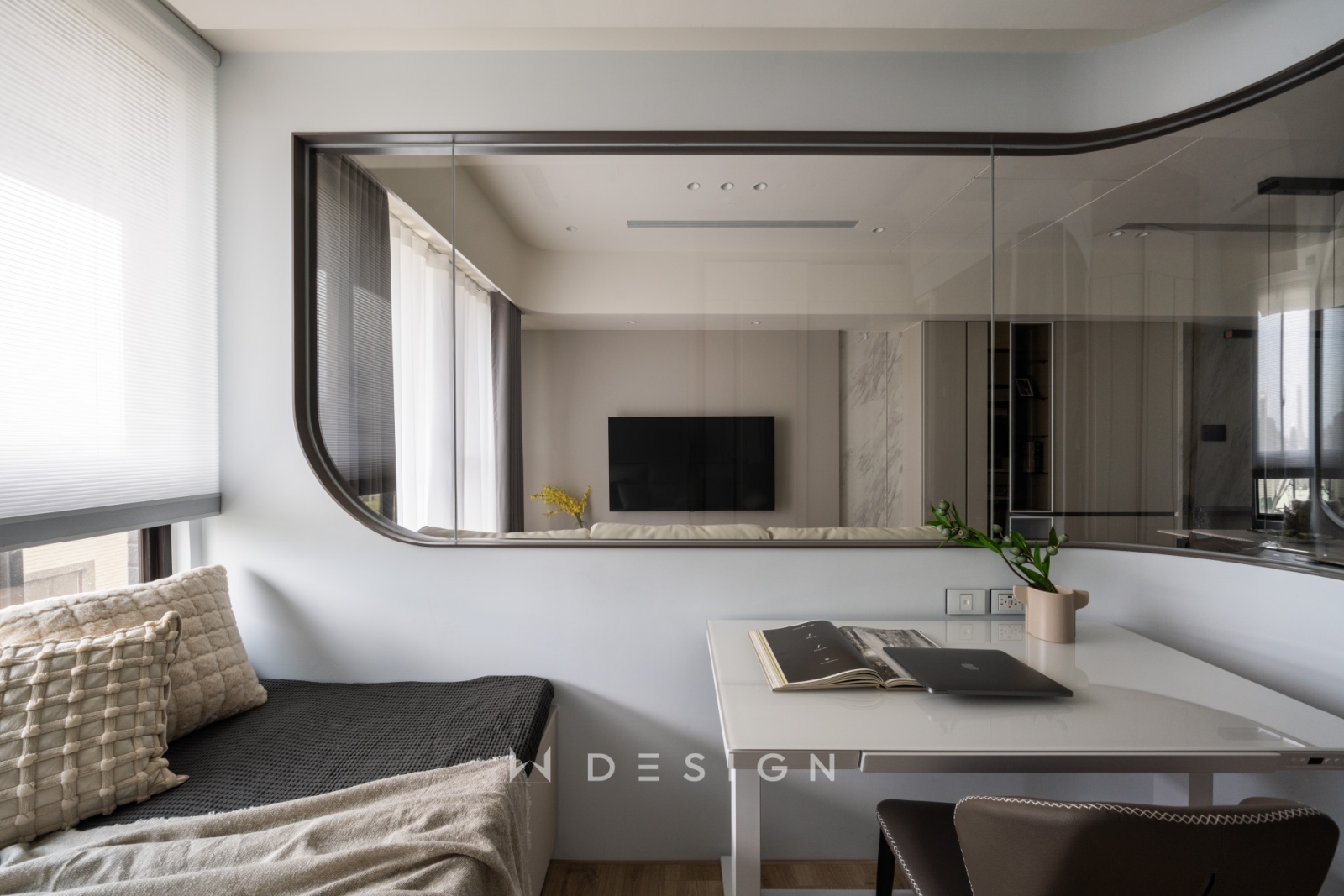 這類半開放式設計可有效提升小坪數住宅的空間感,讓書房既有獨立功能,又不造成壓迫或視覺阻隔。