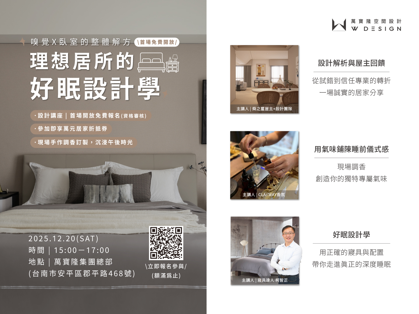 本次說明會由萬寶隆團隊與品牌合作共同策劃,內容涵蓋室內設計、嗅覺與臥室的整體解方。無論您正準備打造心中的夢想之家,或是希望提升居家舒適度與睡眠品質,都能從本場說明會中獲得實用且可立即應用的生活靈感。