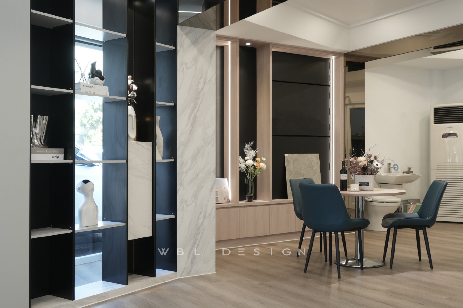 整體以明亮白為主調,搭配大面落地窗引入自然光,營造出通透開闊的空間感。木質地坪與石紋材質點綴出沉穩質感,黑白展示架與嵌燈光源巧妙結合,形塑現代俐落氛圍。提升商務接待與品牌形象的功能性與專業度。