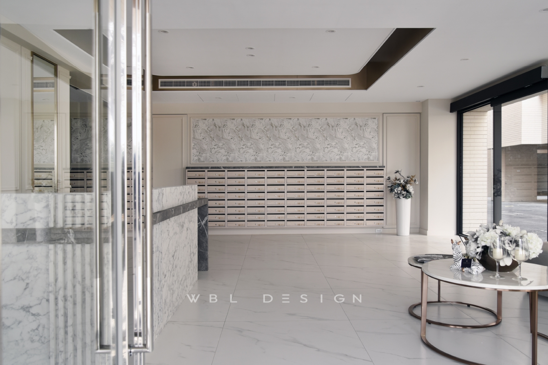 以米白與灰白大理石鋪陳,營造典雅內斂的迎賓氛圍。櫃台設計融合對比材質,提升質感層次;背牆信箱與花藝佈置為整體增添細膩精緻感。沙發區配置柔弧造型與金屬圓几,提供訪客舒適等候與交流的功能。