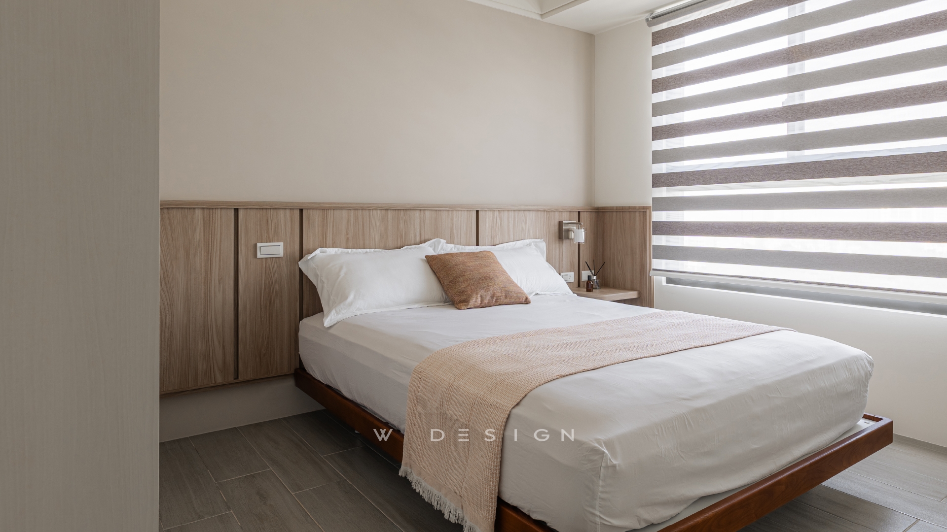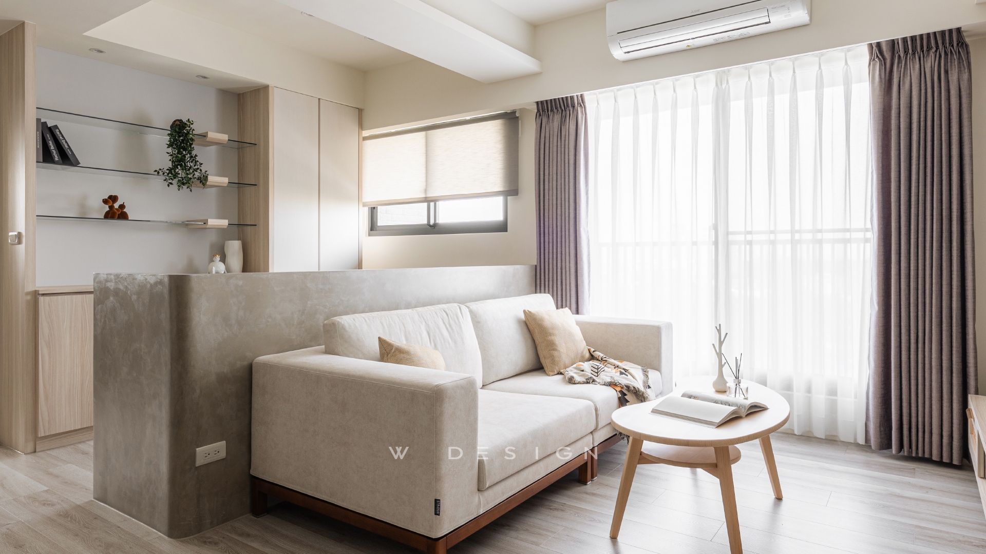 以淺米色為基調,搭配溫潤木質與奶茶色軟裝,營造出柔和且清新的居家氛圍。客餐廳一體設計強化交流功能,書櫃與收納櫥櫃提升實用性。臥室延續暖色調,結合簡約線條與圓角細節,打造舒心靜謐的休憩場域。