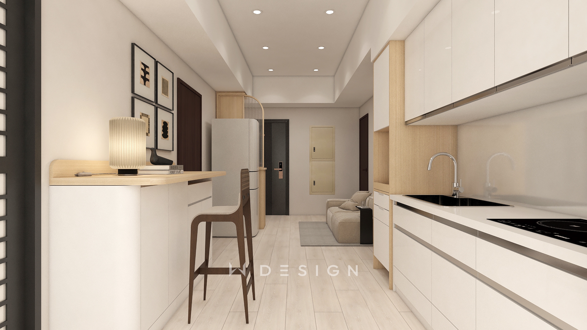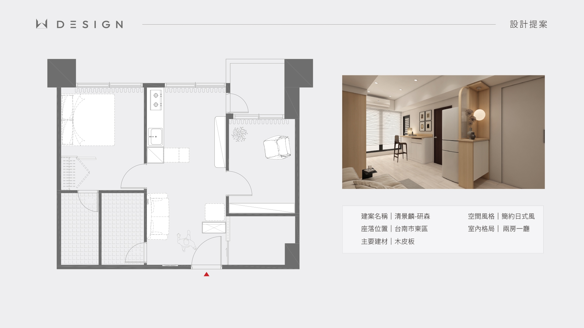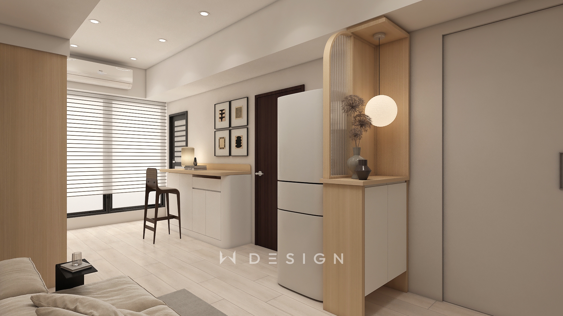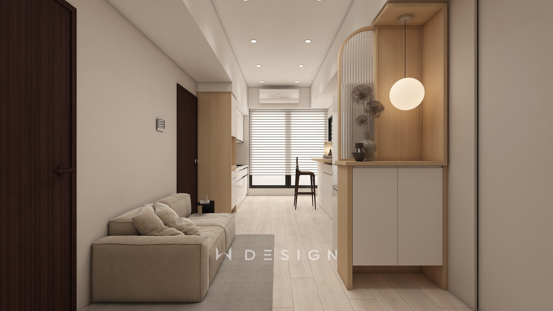以木皮板作為空間核心材質,從玄關一路延伸至餐廚與起居區域,形成連續而溫潤的視覺軸線。透過圓弧造型、垂直格柵與間接光源,弱化樑體與狹長格局的限制,形塑出簡約日式的柔和表情