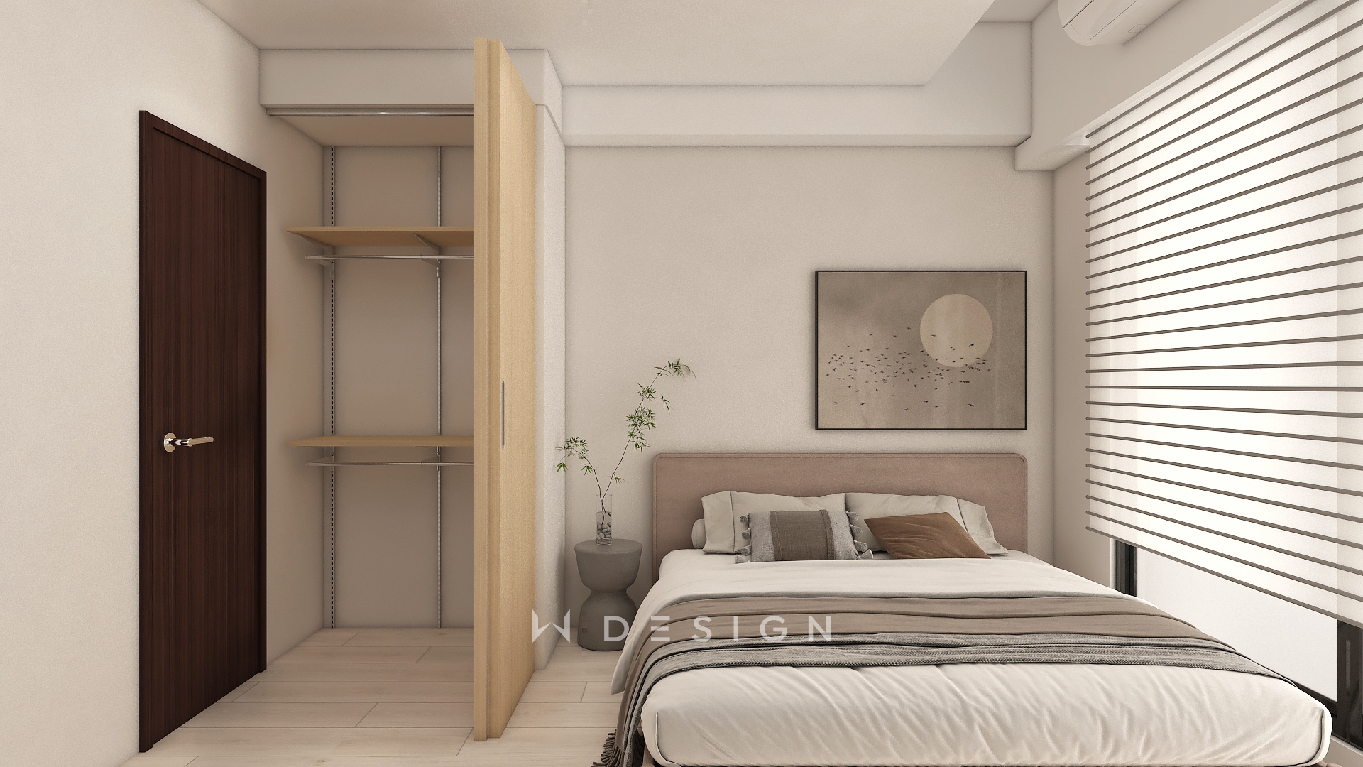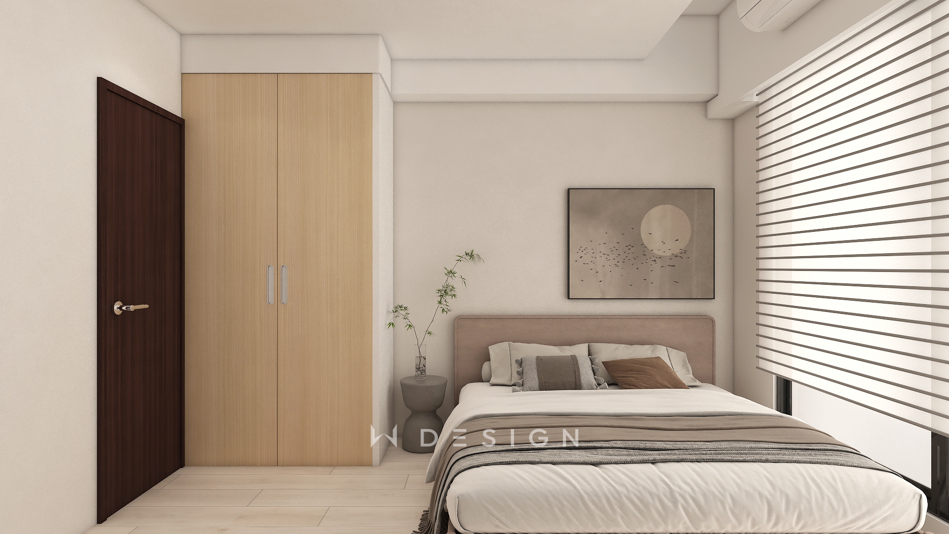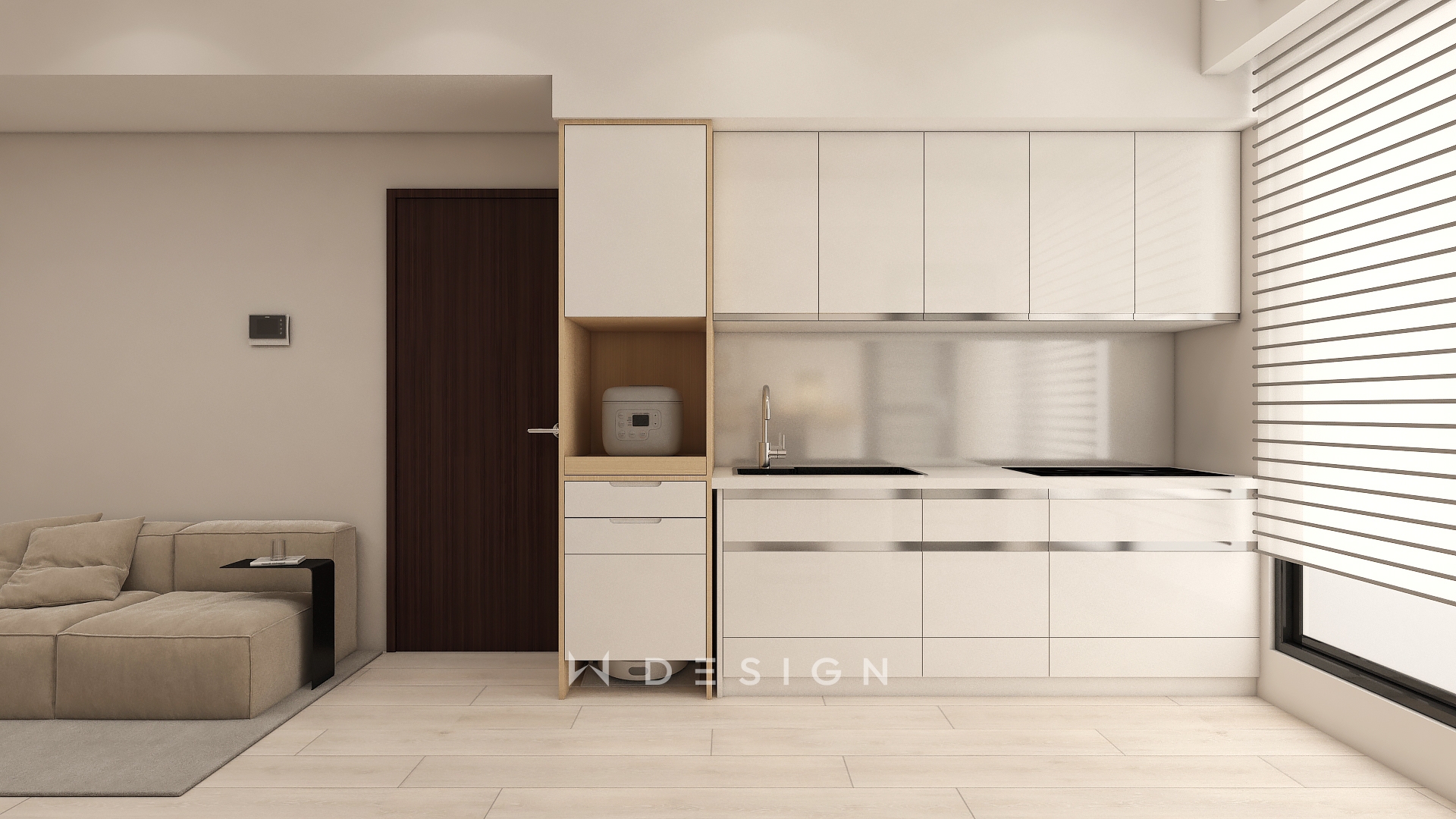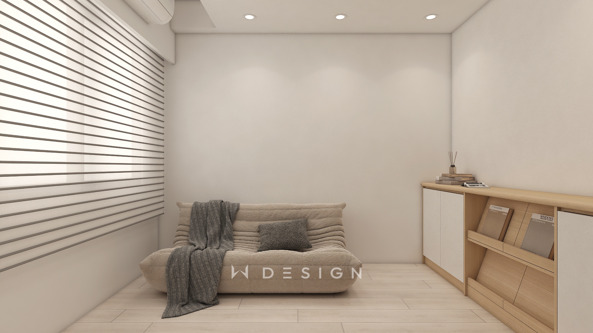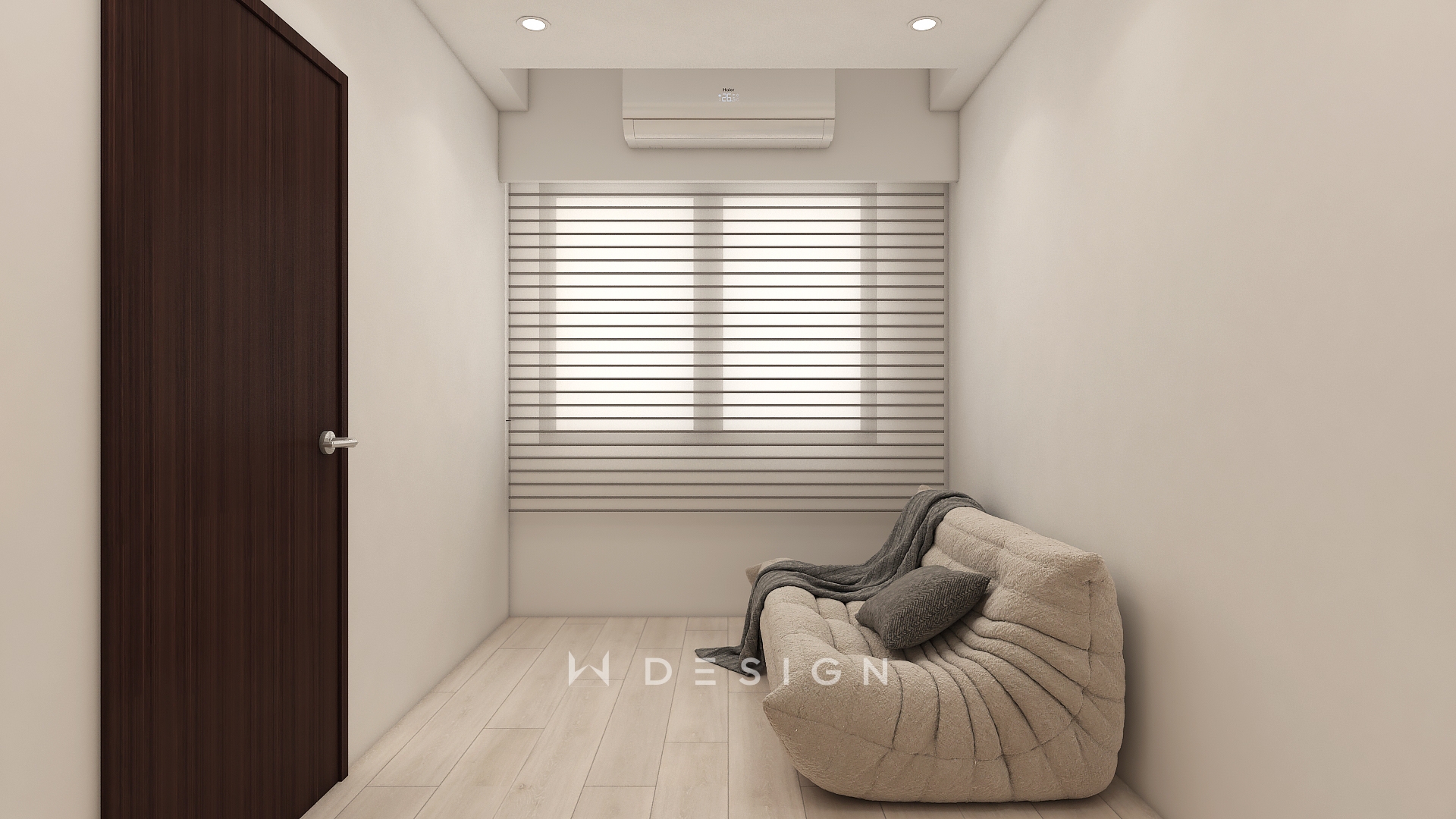 以木皮板作為空間核心材質,從玄關一路延伸至餐廚與起居區域,形成連續而溫潤的視覺軸線。透過圓弧造型、垂直格柵與間接光源,弱化樑體與狹長格局的限制,形塑出簡約日式的柔和表情