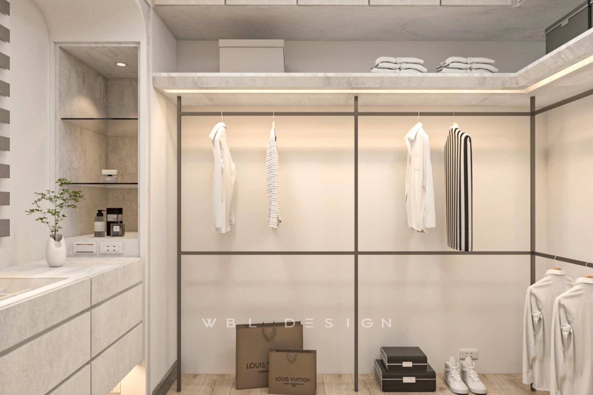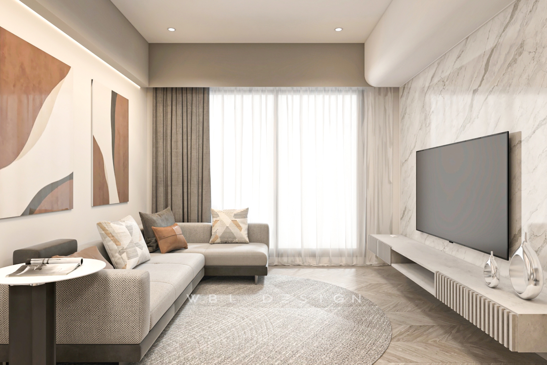 空間以柔和米白、溫潤木質與沉穩灰階交織出溫雅高質感的氛圍,營造舒心放鬆的生活情境。客廳暖灰色調與大理石電視牆形塑優雅現代,餐廚區以鏡面增添摩登氛圍,主臥以跳色皮革床背作為視覺重點。